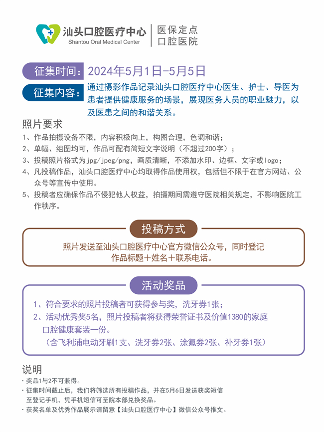 投稿者需將作品發(fā)送至汕頭口腔醫(yī)療中心官方微信公眾號(hào),并注明作品名稱、作者姓名及聯(lián)系方式。我院將對(duì)提交的作品進(jìn)行評(píng)選,優(yōu)秀作品將在醫(yī)院官方網(wǎng)站、微信公眾號(hào)等渠道進(jìn)行展示,并有機(jī)會(huì)獲得潔牙券或家庭口腔健康套裝等福利。