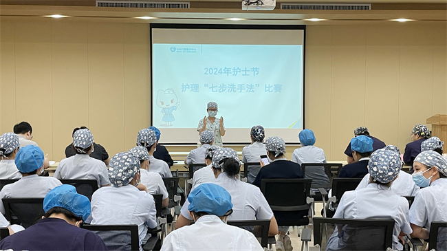 手衛(wèi)生是護理工作中至關(guān)重要的環(huán)節(jié),落實手衛(wèi)生規(guī)范是預防與控制醫(yī)院感染、保障醫(yī)療質(zhì)量及安全的有效措施。在比賽中,選手們以個人的形式,在8分鐘內(nèi)展示了“七步洗手法”的標準操作流程,每個動作要領(lǐng)都準確細致,充分體現(xiàn)了護理人員嚴謹?shù)母锌乩砟罴霸鷮嵉淖o理專業(yè)功底。