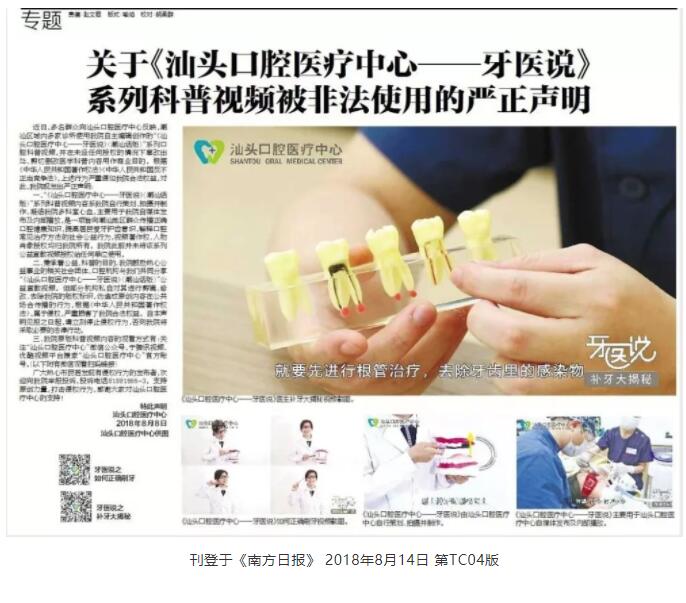 二、秉承著公益、科普的目的,我院鼓勵(lì)熱心公益事業(yè)的相關(guān)社會(huì)團(tuán)體、口腔機(jī)構(gòu)與我們共同分享“《汕頭口腔醫(yī)療中心——牙醫(yī)說(shuō)》(潮汕話(huà)版)”公益宣教視頻。但部分機(jī)構(gòu)私自對(duì)其進(jìn)行剪輯、修改、去除我院的版權(quán)標(biāo)識(shí),偽造成原創(chuàng)內(nèi)容在公共場(chǎng)合傳播的行為,根據(jù)《中華人民共和國(guó)著作權(quán)法》,屬于侵權(quán),嚴(yán)重?fù)p害了我院合法權(quán)益。自本聲明見(jiàn)報(bào)之日起,請(qǐng)立刻停止侵權(quán)行為,否則我院將采取必要的法律行動(dòng)。