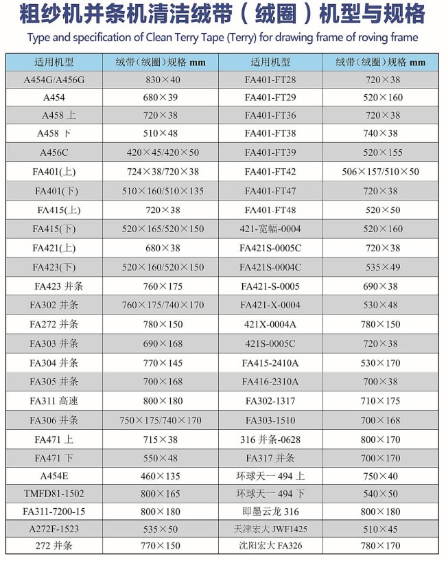 我公司降重推出第九代新型高科技納米材料,粗紗機(jī)、并條機(jī)清潔絨帶(絨),真正做到了無(wú)靜電、抗靜電、無(wú)熒光、永不拉長(zhǎng)、四條絨帶在清潔器上運(yùn)轉(zhuǎn)平穩(wěn)一致,而且不起棉結(jié)、清花效果比羊毛(白呢)和尼龍絨毛植絨帶提高了2倍,清花效果中有利的把附著在膠輥和羅拉上的短絨、飛花、雜質(zhì)清掉,使粗紗干條大大減少了游羽、圈羽現(xiàn)象,永不拉長(zhǎng)節(jié)約了停機(jī)次數(shù),為粗紗車間每年節(jié)省用工17-21個(gè)工期,提高了效率,為紡織廠節(jié)省了開(kāi)支。從前的絨帶全部有熒光,第九代絨帶真正做到了無(wú)熒光,在現(xiàn)代紡紗中,提倡紗線的綠色健康熒光實(shí)際就是化工化學(xué)產(chǎn)品而造成的,我們采用意大利進(jìn)口白棕樹(shù)棕毛,經(jīng)過(guò)12道工序制作當(dāng)前絨化,又開(kāi)發(fā)了先進(jìn)的植絨機(jī)器,讓絨毛和底布結(jié)合的更牢固,如果絨帶上有熒光,就造成了絨帶和羅毛,拉摩擦產(chǎn)生靜電、起棉結(jié)現(xiàn)象,棉結(jié)落到粗紗干上,造成了很大的瑕疵,還有棉紗上有熒光,大大影響了染色有瑕疵、有異纖。新型高科技納米材料絨帶,它降低紗疵、提高成紗質(zhì)量,從而達(dá)到******高立,提高產(chǎn)品******化。